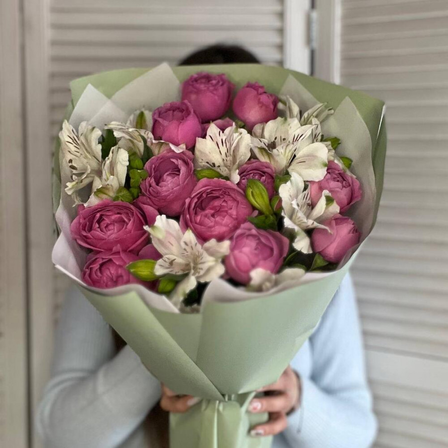 На фото букет «малиновая дымка». В составе: альстромерия 3 шт, кустовая пионовидная роза 4 шт, дизайнерская упаковка 2 шт, атласная лента 1 шт, . Все цветы свежие и ароматные, букет красиво оформлен и отлично подходит для подарка. Доступна доставка цветов или самовывоз.